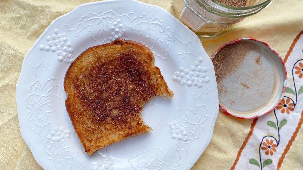 I did not follow Garner’s method exactly, though you are certainly welcome to. (I did, however, use her ratio of 3 tablespoons granulated sugar and 2 teaspoons cinnamon.) Instead of buttering just one side of the bread, I buttered and sugared both, then fried the bread in a nonstick pan (cast iron would work too) over medium-low heat, flipping a couple of times and adding a little more butter and cinnamon-sugar with each flip. Once the bread had crisped enough that it felt stiff when scooted around the pan, I transferred it to a plate and sprinkled on even more cinnamon-sugar.