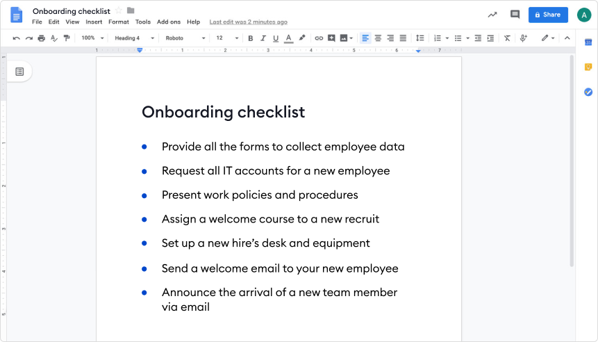 Don’t forget to tailor the onboarding process by giving employees enough time and freedom to digest new information and plunge into tasks. Not everyone is a fast learner, so adjust the pace accordingly. To ensure that a person is managing well through onboarding, use interactive checklists. Here’s an example: