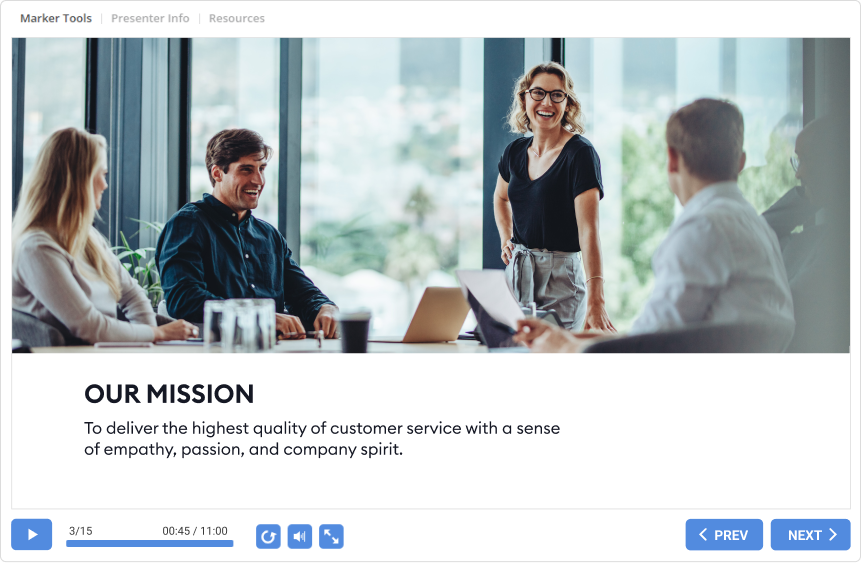 Pro tip: Create an introductory online course that includes welcome videos, materials about your company’s mission and culture, overviews of your products/services, and compliance guidelines. Tests and quizzes will help with the memorization of all this information.