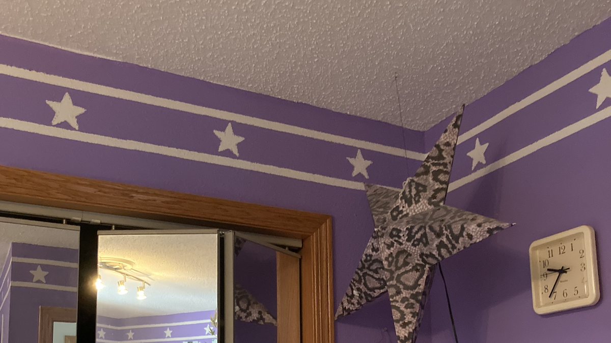 The design doesn’t have to be intense to have an impact—you can see the photo above for a simple example, courtesy of my mother and me. We made two lines around the top of the wall of my childhood bedroom, then cut stars out of contact paper and stuck them in the center. When the paint dried, we removed the sticky parts and had a sharp border to add just a little dimension that broke up the bold color.