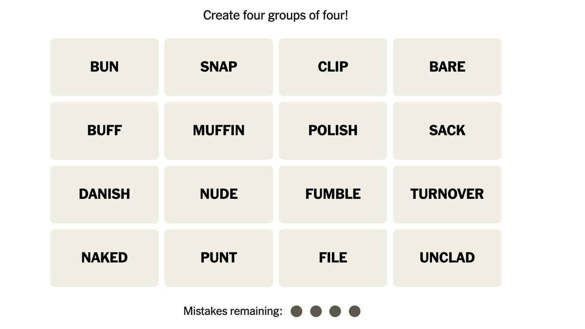 You win when you’ve correctly identified all four groups. But if you make four mistakes before you finish, the game ends and the answers are revealed.