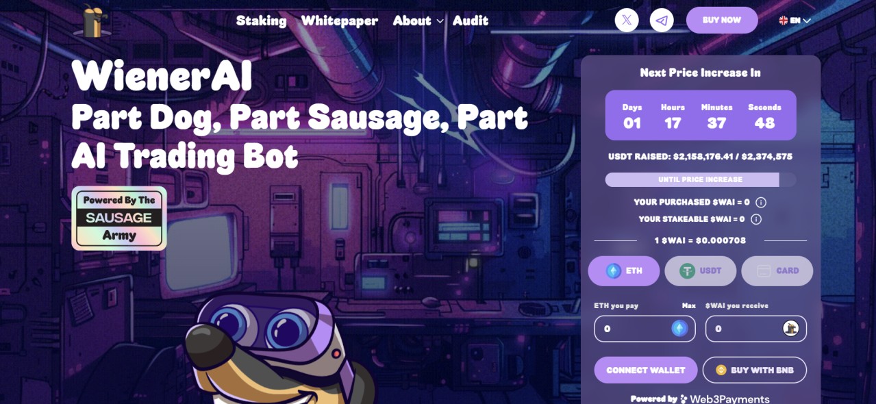 WienerAI is a meme coin inspired by the popular internet culture of dog memes and sausage jokes. However, it aims to be beyond than just a meme token – it also incorporates AI technology to provide utility as a trading bot and automated trading platform.
