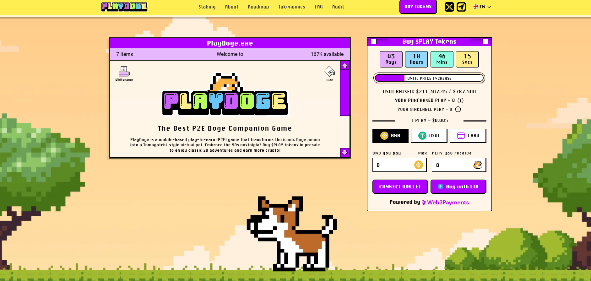 After downloading the mobile app (will be available once the presale is over), players will adopt their very own digital Doge that needs regular feeding, sleeping, playing, and training – just like a real pet. However, this Doge lives in classic 8-bit side-scrolling games that players can complete to earn $PLAY while embracing 90s nostalgia. If the Doge is neglected, it may run away to a new home or tragically pass away.